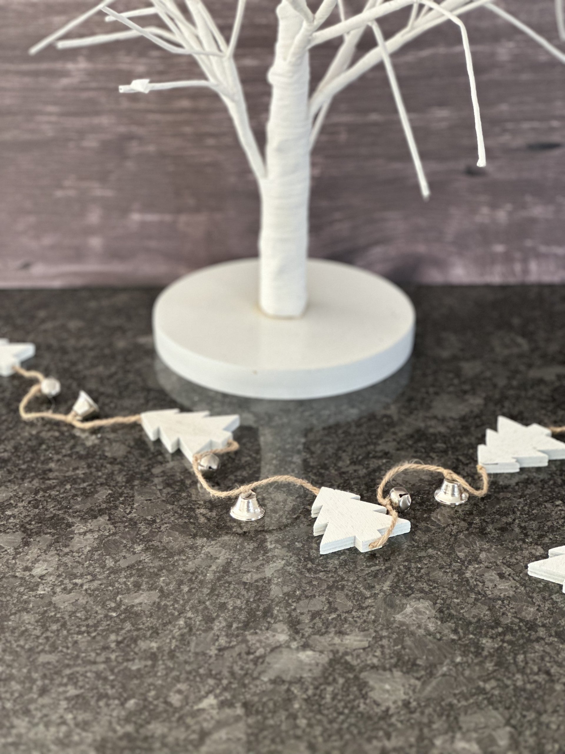 Perfect for hanging from your mantlepiece, a door handle or draped along a table, this jute string rustic garland with white wooden Christmas trees and silver bells adds a simple elegance to your home